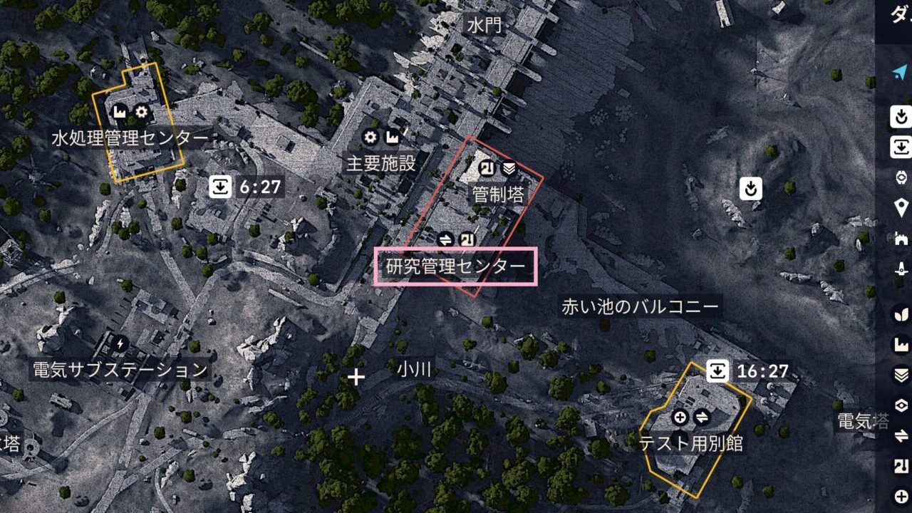 まずは「ダム戦場」マップに降りたら、南側から「研究管理センター」を目指しましょう。