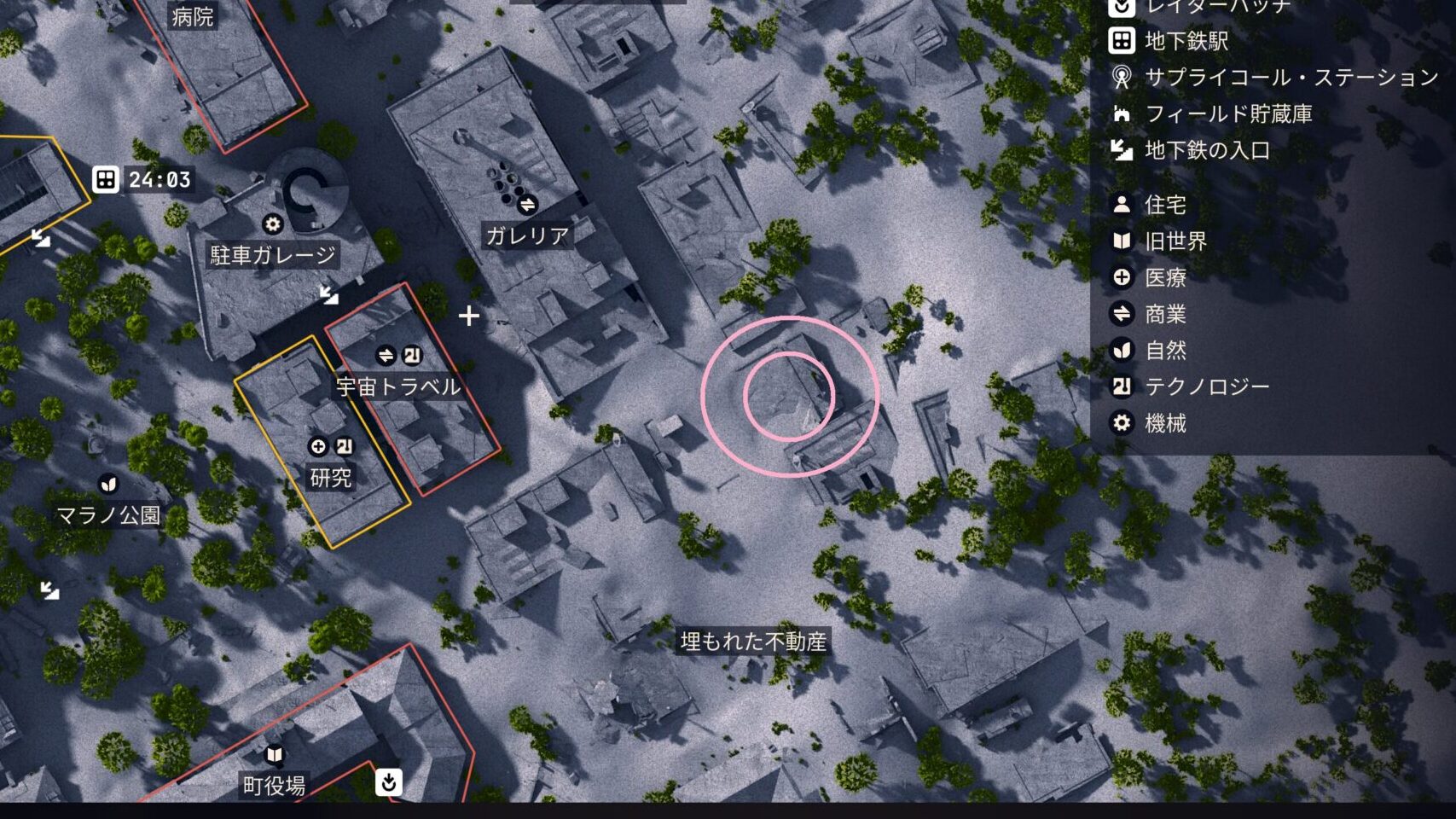 - 場所: 「埋もれた街」にある「看板のある建物」