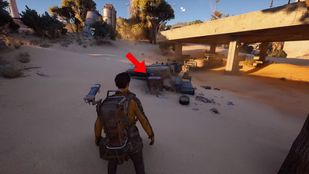 ガソリンスタンドに到着したら、建物の西側、砂に半分埋まった大きな機械の隣にある四角いコンテナを探してください。