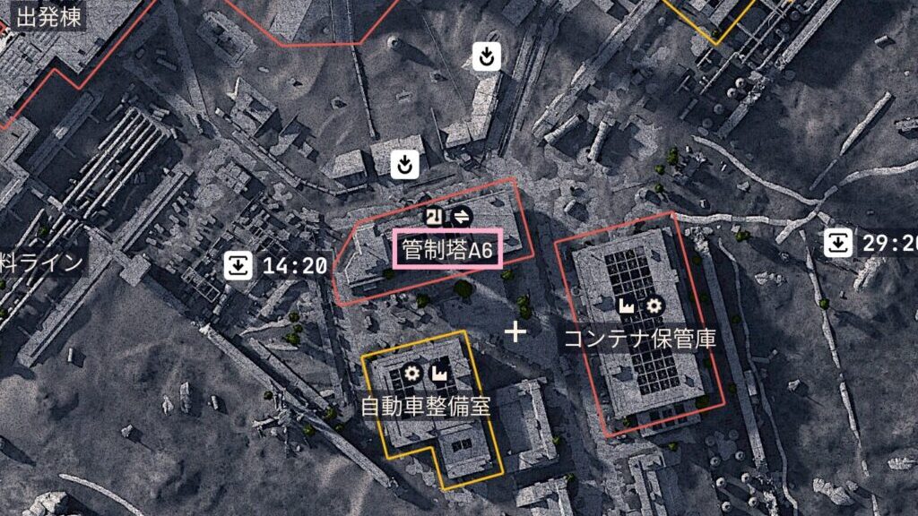 マップ中央付近にある巨大な建物、「管制塔A6」を目指しましょう。ここはかなり目立つので見つけるのは簡単ですが、他のプレイヤーも集まりやすい激戦区です。