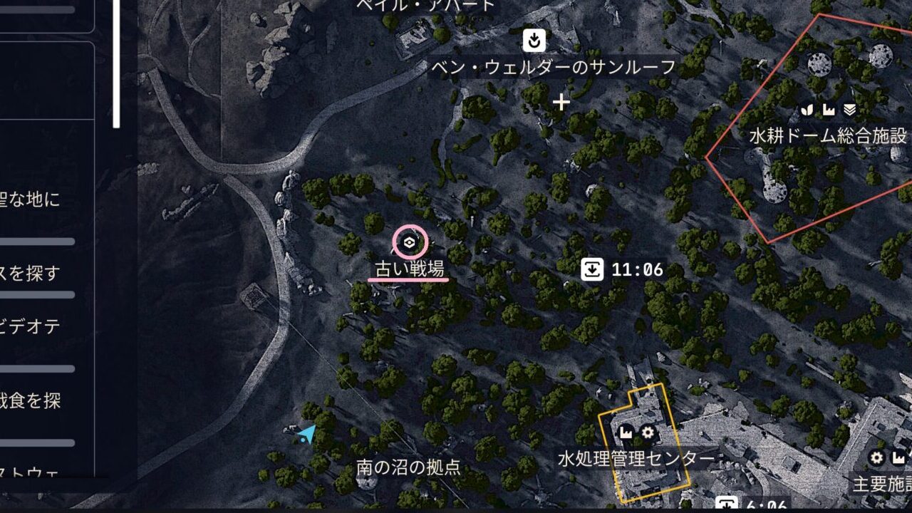 - 場所の目安: マップ南側の「ペイル・アパート」と「南の沼の拠点」の間にあります。