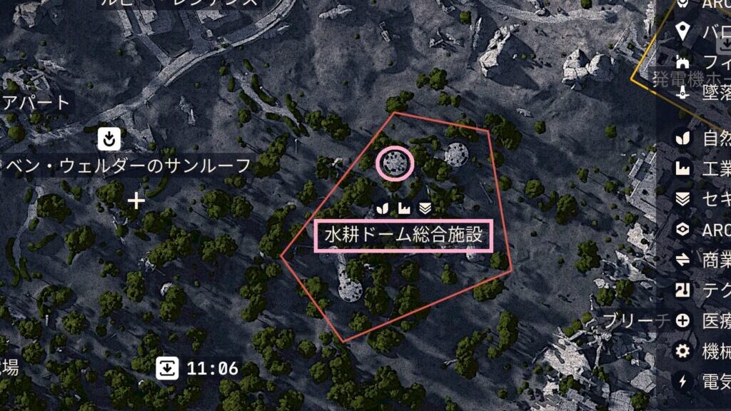 まずはマップ北西部にある「水耕ドーム総合施設」を目指しましょう。マップ上では大きな赤いマーカーで表示されているので、見つけるのは簡単です。