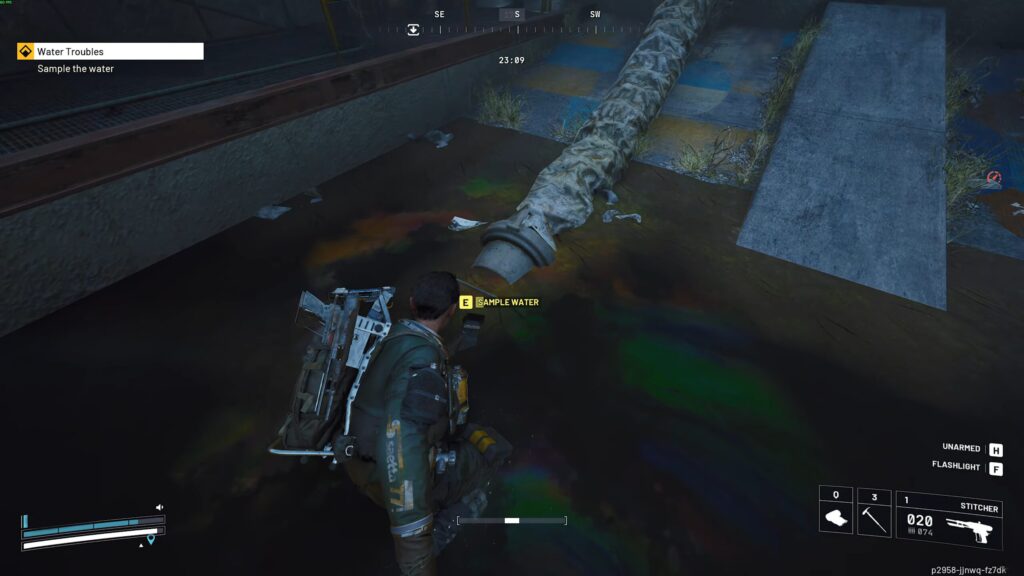 - アクション: 部屋の左側にあるパイプが、濁った水たまりに繋がっています。そのパイプに近づくと「採水」というプロンプトが出るので、インタラクトすればOK!